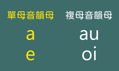 由一個母音構成的韻母稱為單母音韻母,例如a、e。 由二個以上母音構成的稱為複母音韻母,例如au、oi。