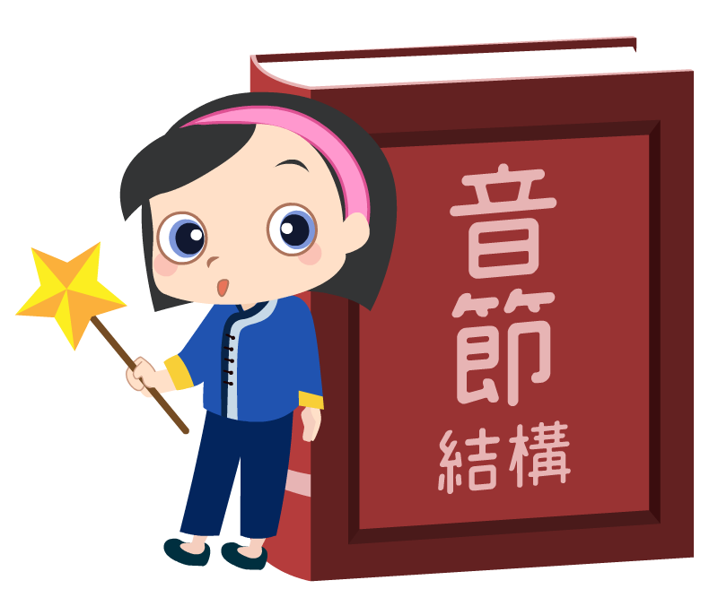 客語音節結構可分為「聲母」、「韻母」、「聲調」三部分,其中「韻母」又可分為「韻頭」、「韻腹」、「韻尾」,現將音節結構圖示如下: