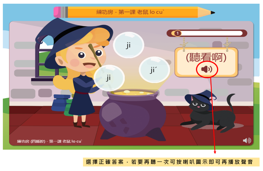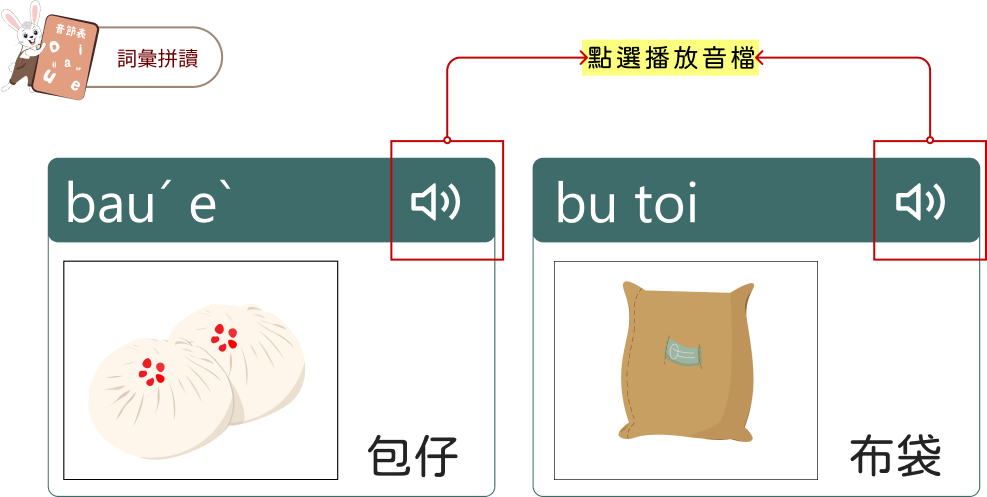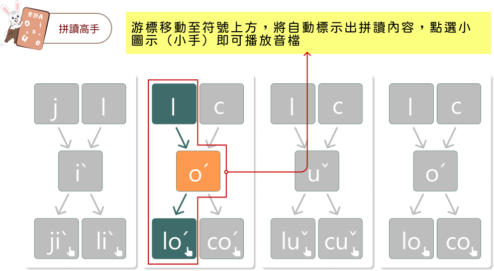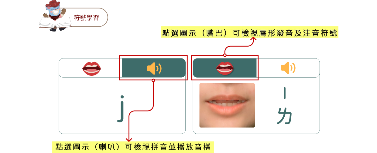 結合上方學習到的符號,幫助學習者正確的拼音方式。
