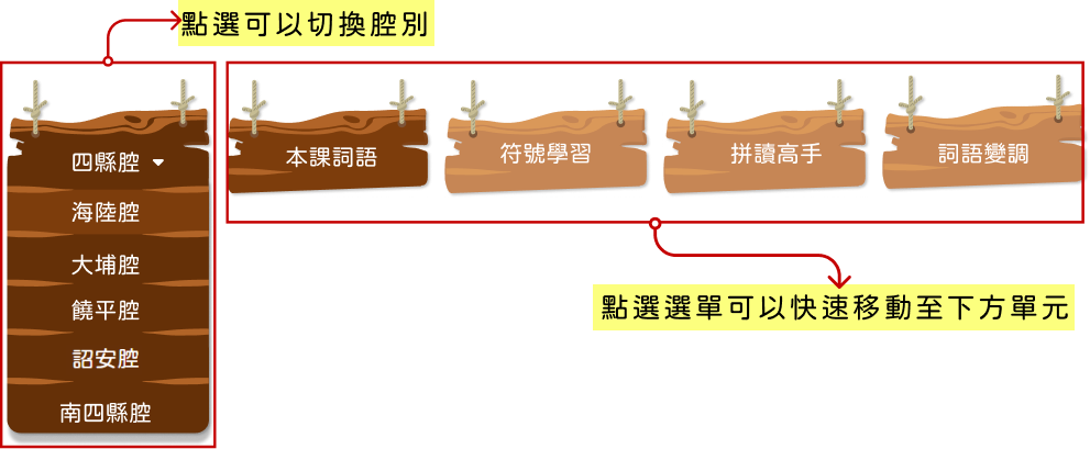 此部份可讓學習者可以快速找想要學習的部分及切換腔調。